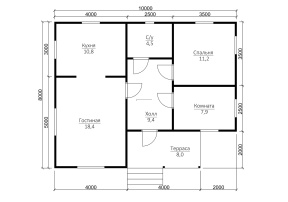 Планировка помещений рациональна и оправдана, что гарантирует удобное расположение небольшой семьи или компании путешественников. Сооружение размером 8х10 м. имеет надежную двускатную крышу, цвет которой владелец может выбрать самостоятельно. Кроме того, компания охотно внесет изменения в первоначальный проект для придания коттеджу особого стиля и дополнительного комфорта.