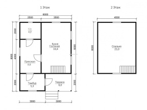 Общая площадь здания составляет 64.3 кв.м., размер дома – 6х8 м.. В доме установлены межкомнатные филенчатые двери (08,x2 м.), которые не только эффектно выглядят внешне, но и отличаются небольшим весом и долговечностью.