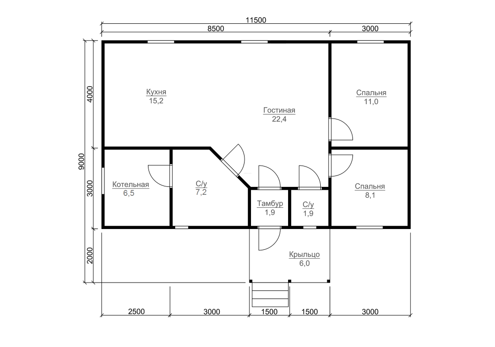 Общая площадь здания составляет 74.5 кв.м., размер дома – 7х11,5 м.. В доме установлены межкомнатные филенчатые двери (08,x2 м.), которые не только эффектно выглядят внешне, но и отличаются небольшим весом и долговечностью.